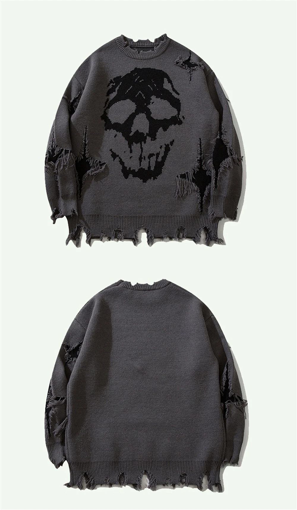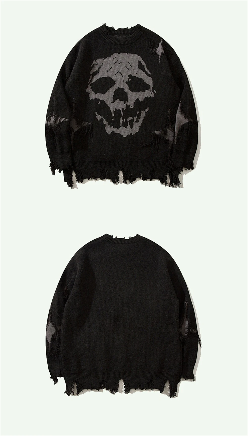 ritual knitwear, distressed skull sweater, shadow streetwear system, VOIDWEAR oversized knit, goth streetwear USA. #VOIDWEAR #ShadowSystem #RitualKnit