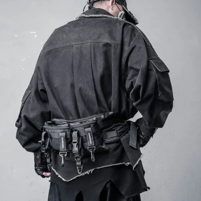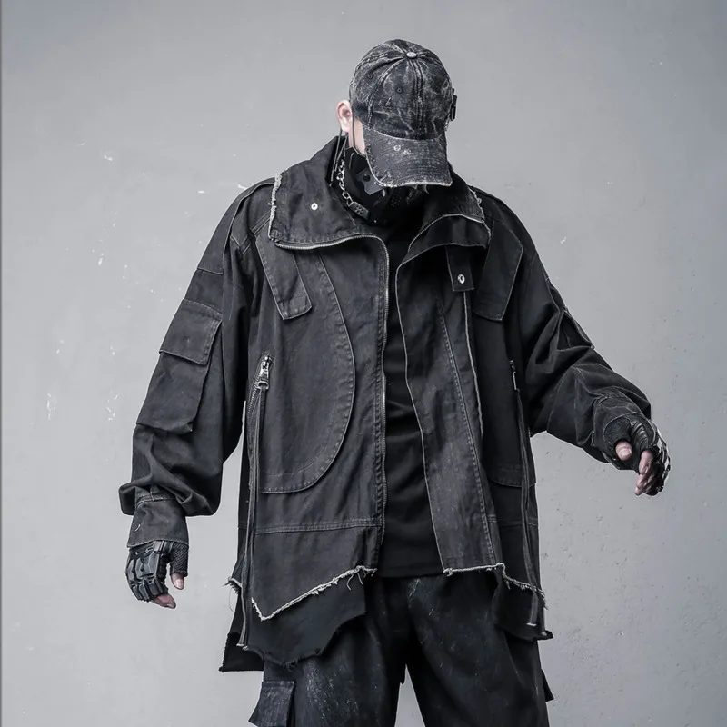 ritual-inspired streetwear, minimalist techwear aesthetic, shadow-motion apparel, VOIDWEAR oversized jacket, punk safari streetwear